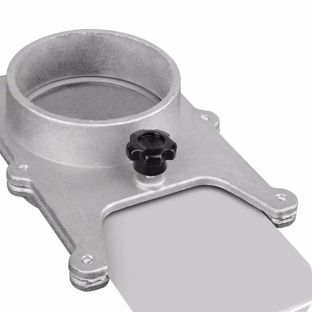 Introducing the 5-Inch Aluminum Blast Gate by POWERTEC. This must-have dust collector attachment helps maximize your dust collector system by regulating proper air flow to your designated machine of choice. Open and closed, it acts as an in-line gate to control the vacuum flow to specified areas of your work shop. Additionally, this aluminum blast gate works seamlessly with properly sized plastic and metal ducts, flexible hoses and 5-inch ports for an assortment of popular brands. Self-Cleaning: Unlike other models that require constant attention, this unit possesses a self-cleaning gate (open slot) at the back that allows for clog-free operation. It also possesses a built-in stop that keeps the gate exactly where you need it during operation. When properly used, this self cleaning blast gate not only helps eliminate constant maintenance from jamming, but prevents air leakage that would otherwise disrupt your workflow. Premium Construction: Our Blast Gate features a solid aluminum body with a highly durable stainless steel gate providing a more long term and durable solution to plastic versions. Universal Fit: Featuring a nominal 5 inch OD diameter, this unit will provide a perfect fit for most professional and at-home workshop dust collection systems. Whether you re a beginner or seasoned woodworker, it s extremely easy to use and install.