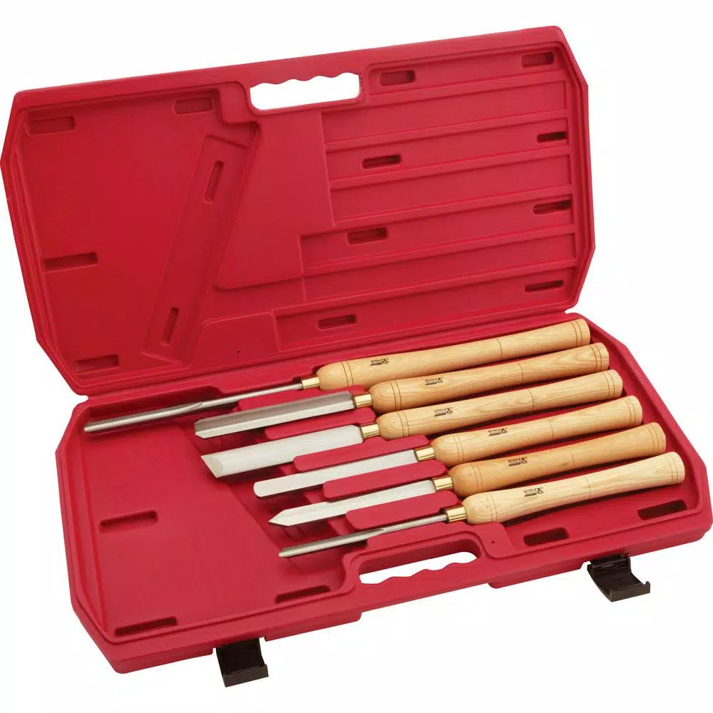 For serious wood turners! This Deluxe Lathe Chisel Set features beefy ash handles for unsurpassed control, brass ferrules and high speed steel blades. Includes: 15/16″ x 17″ Parting Tool, 13/16″ x 17″ Round Nose and 3/8″ x 19″ Long Bowl Gouge; 1″ x 17″ Skew, a 5/8″ x 22-1/2″ Roughing Gouge and a 3/8″ x 19″ Spingle Gouge.