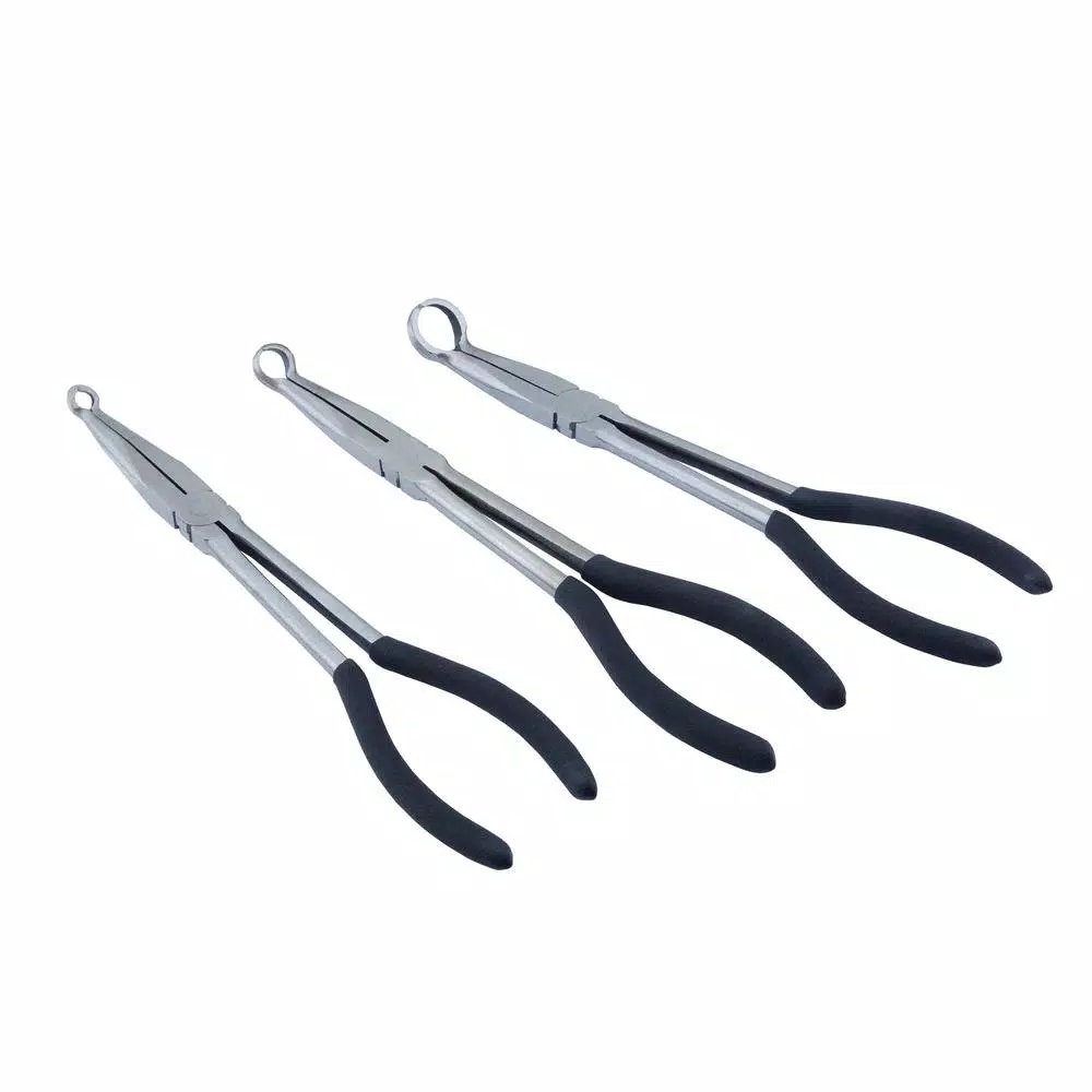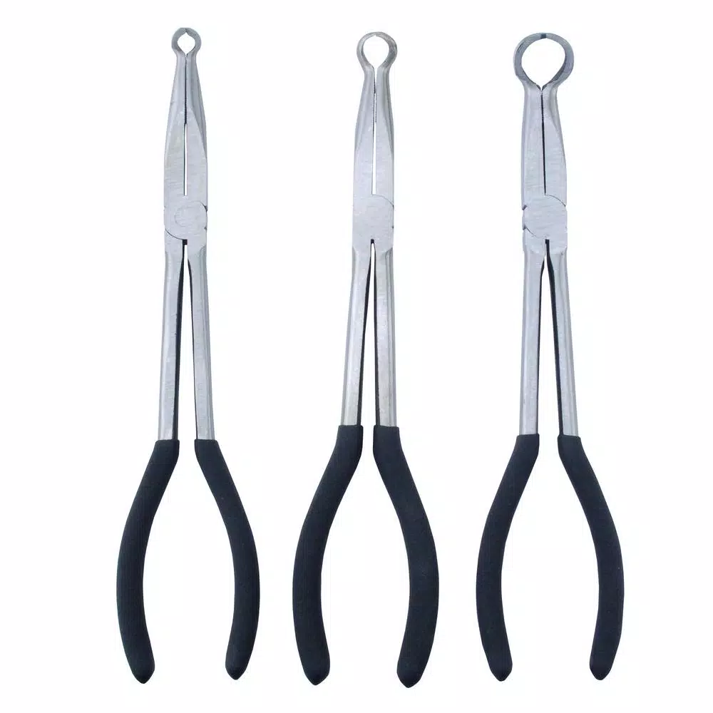 The Steel Core 3-piece 11 in. L reach hose grip pliers set is specially designed to allow you to grip hoses with enough leverage to twist them free. Remove and install heater hoses, vacuum lines and fuel lines without the worry of damaging any hoses. These extra-long hose grip pliers are great for reaching tight spaces and features comfort grip handles.