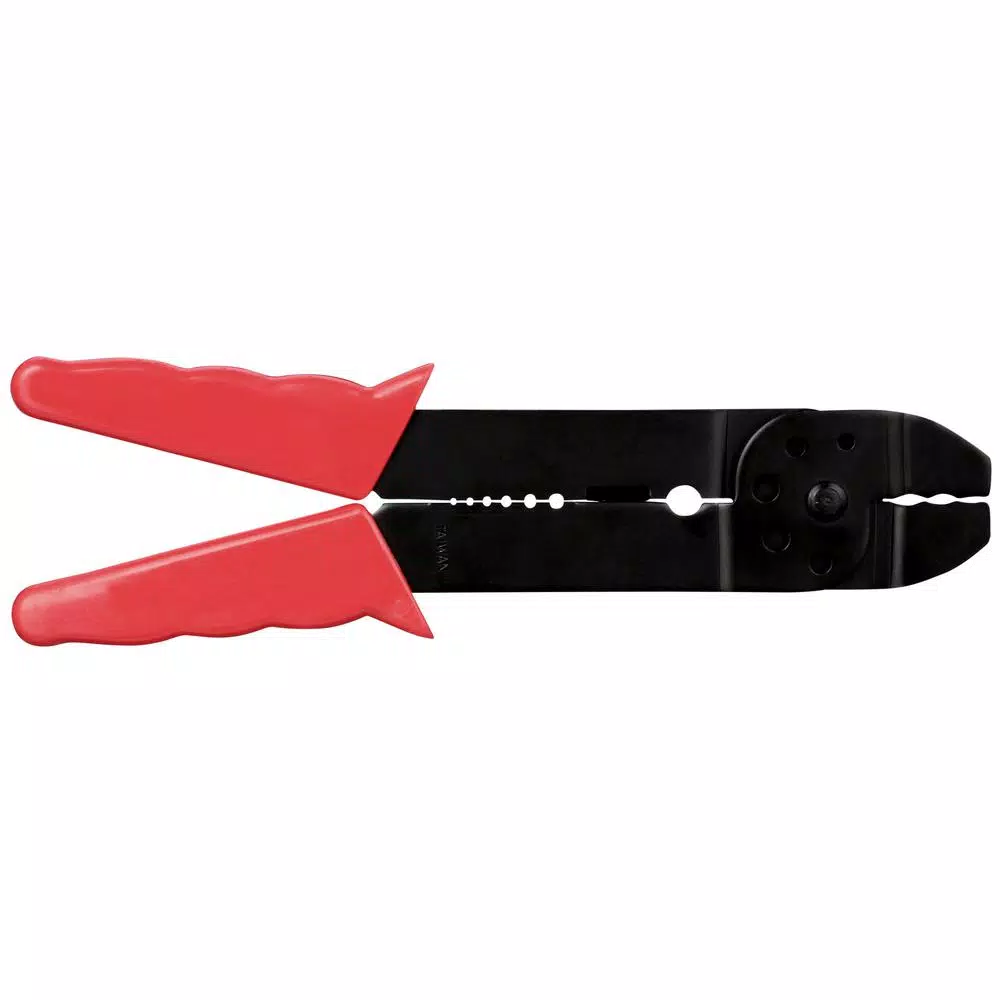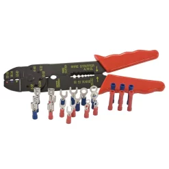 This tool and terminal kit include a handy tool that cuts and strips copper or aluminum 10-22 AWG solid and stranded wire, crimps coax and cuts and rethreads bolts. Kit also includes the most popular sizes and types of terminals for jobs around the house and under the hood. These quick and reliable crimp-type ring and spade terminals, female disconnects and butt splices feature vinyl insulated barrels and are color coded by wire gauge size. Terminals are cULus listed and rated at 600-Volt with a temperature rating of 167° Fahrenheit (75° Celsius). Kit includes 3 each ring and spade terminals, butt splices and female disconnects in 22-16 AWG (Red) and 3 each in 16-14 AWG (Blue) for a total of 24 terminals and one tool all packaged in a handy reusable organizing case.