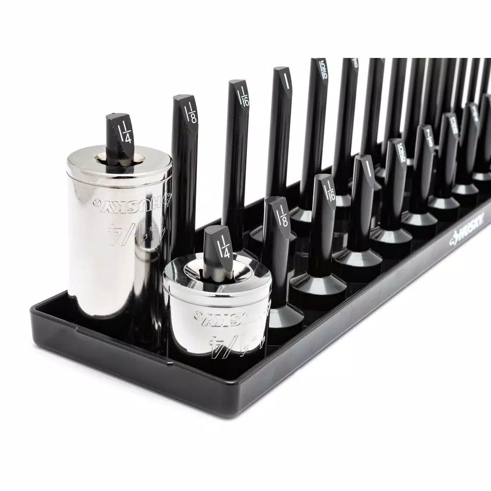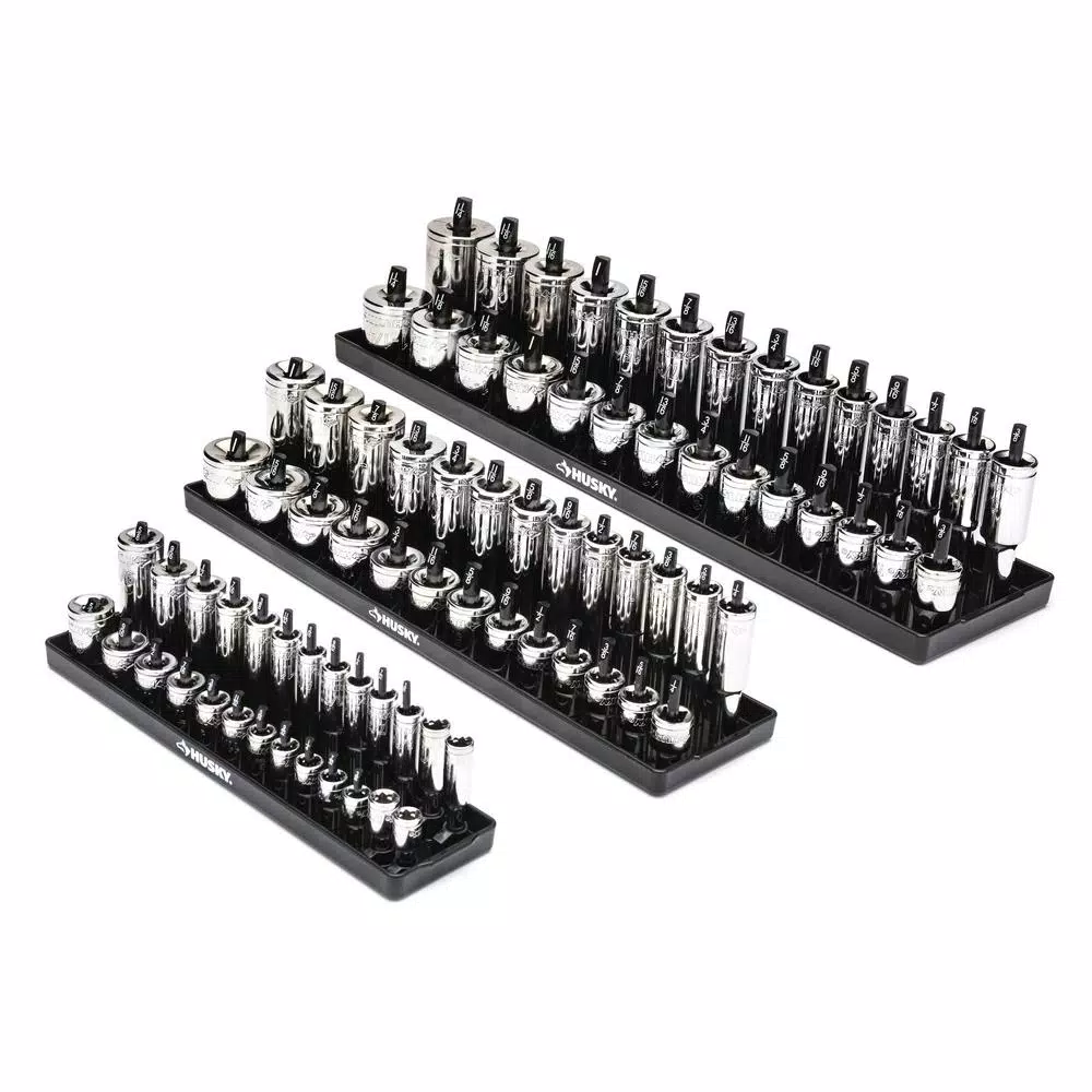 This Husky 6-Piece SAE and Metric Socket Rack Set is a great way to keep your sockets organized and in 1 location. This set includes 3 SAE and 3 Metric racks designed for 1/4 in., 3/8 in. and 1/2 in. drive sizes, which hold 26, 26 and 28 sockets, respectively. Fit standard or deep sockets down over the pegs and use the size markers printed on each pegs top to find the right socket for any fastener. The pegs are sturdy and break resistant giving you a durable solution for your individual sockets.