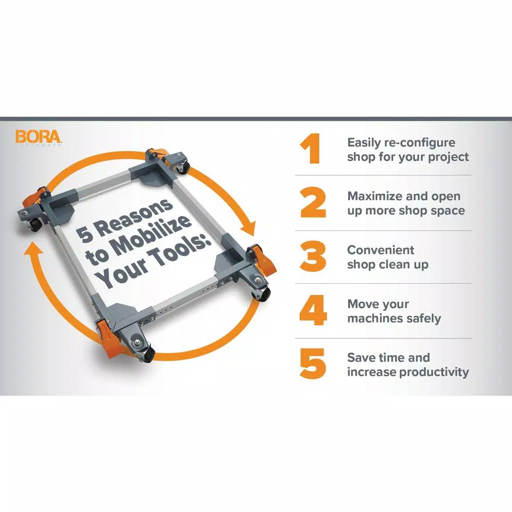 PORTAMATE has been a pioneer in developing strong, sturdy mobile bases for woodworking and machine shop tools, so it is no surprise that we’re leading the pack again with this 1500 lb. universal mobile base. It’s an industrial strength, fully-adjustable rolling platform – with a weight capacity that exceeds the competition by hundreds of pounds. Like our other mobile bases, this base increases and decreases size in 1 inch increments. Going from 20.75 x 23.75 in. to 28 x 33.5 in. The all-steel construction, solid corner brackets, and four casters (with foot control locking levers) ensure the strength and stability that you are looking for. The PM-3550 is ideal for virtually all larger machines, like band saws, planers, jointers, and many more. It is also the perfect rolling base for cabinets, large safes, heavy tool boxes, or anything else you need to make mobile. Everything needed is included and backed by a 1-year warranty.