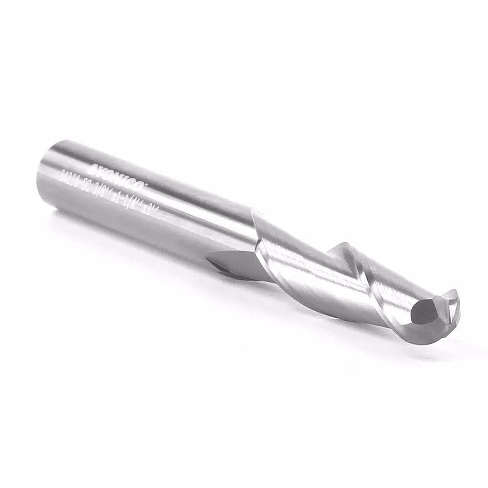 This 2 flute round nose endmill has a cutting diameter of 3/8 in. and a cutting length of 1-1/4 in. The shank is 3/8 in. Dia and the overall length is 3 in. Ball nose spiral end mills are used for smooth contouring and fine detail passes with a CNC router and often for complex shapes like 3D carvings. The rounded tips reduce tool markings, which produce smooth curves that would be impossible to achieve with flat end bits. Small diameter ball nose end mills are used for projects with intricate detail while larger bits are used for smoother projects with more gradual slopes. These bits are also excellent for routing fluted columns and channels in cutting boards and countertops edges.