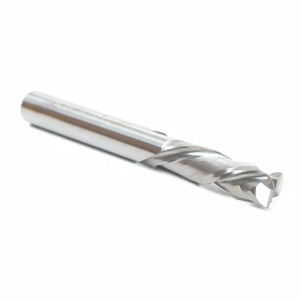 Best for achieving a smooth finish on laminate or veneer finish applications. Cutting Diameter: 1/4 in. Cutting Height: 1 in. Shank Diameter: 1/4 in. Overall Length: 2-1/2 in. Flutes: 2 Compression bits cut down from the top of the stock and up from the bottom of the stock simultaneously. The bit’s unique and complex geometry forces the trimmed material to be compressed toward the center of the stock leaving behind a smooth and sharp finish free of chips on both the top and bottom edges. This bit can also be used for mortising projects that require a smooth bottom surface without sacrificing the mortised edge finish. When working with any veneer finished material in your CNC machine, you need a compression spiral end mill to make full depth cut. These bits are designed to leave clean edges on the top and bottom faces of any material. The compression bit’s unique design pulls chips upward at the bottom of the stock and downward at the top face, producing chip-free surfaces that are perfect for cabinet and furniture parts. Compression cut spiral end mills are excellent for melamine, plywood, MDF and solid wood.