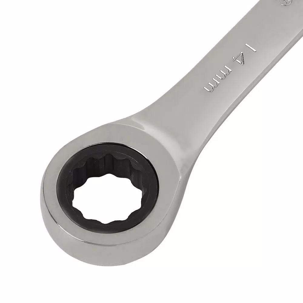 The GearWrench 14 mm Combination Ratcheting Wrench features a full chrome polish finish for durability and corrosion resistance. Ratcheting box end increases productivity while reducing hand fatigue. The box end utilizes Surface Drive technology which provides off-corner loading for better grip and reduced fastener rounding.