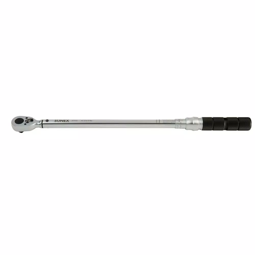 The Sunex 20250 ½ in. Drive 30-250 ft.-lbs. 48T Torque Wrench has a 48 tooth ratcheting mechanism that is accurate to ±3% clockwise and ±6% counterclockwise. It is made of high quality internal components for professional performance and has a heat-treated tube with a knurled aluminum handle for a better grip. The Sunex 20250 is designed to signal the desired torque by an audible click and impulse. This torque wrench comes in a convenient storage case and includes a certificate of calibration.