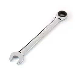 TEKTON Ratcheting Combination Wrenches offer the speed and ease of a ratcheting box end that stays continuously engaged with fasteners, eliminating the need to re-fit after each turn. A 6-point opening provides a sure, snug fit on hex-shaped fasteners so you can apply maximum torque without slipping off, preventing knuckle aggravation. To prevent round-off, the box end opening contacts and applies force to the flat sides of fastener heads rather than the corners. Equipped with a 72-tooth ratchet gear that needs just 5 degrees of swing arc to reach the next tooth position, it is fast and efficient when there is not much room to move. The open end is angled 15 degrees, allowing the wrench to be flipped over with each rotation to engage the fastener twice as often when you are working in tight spaces.