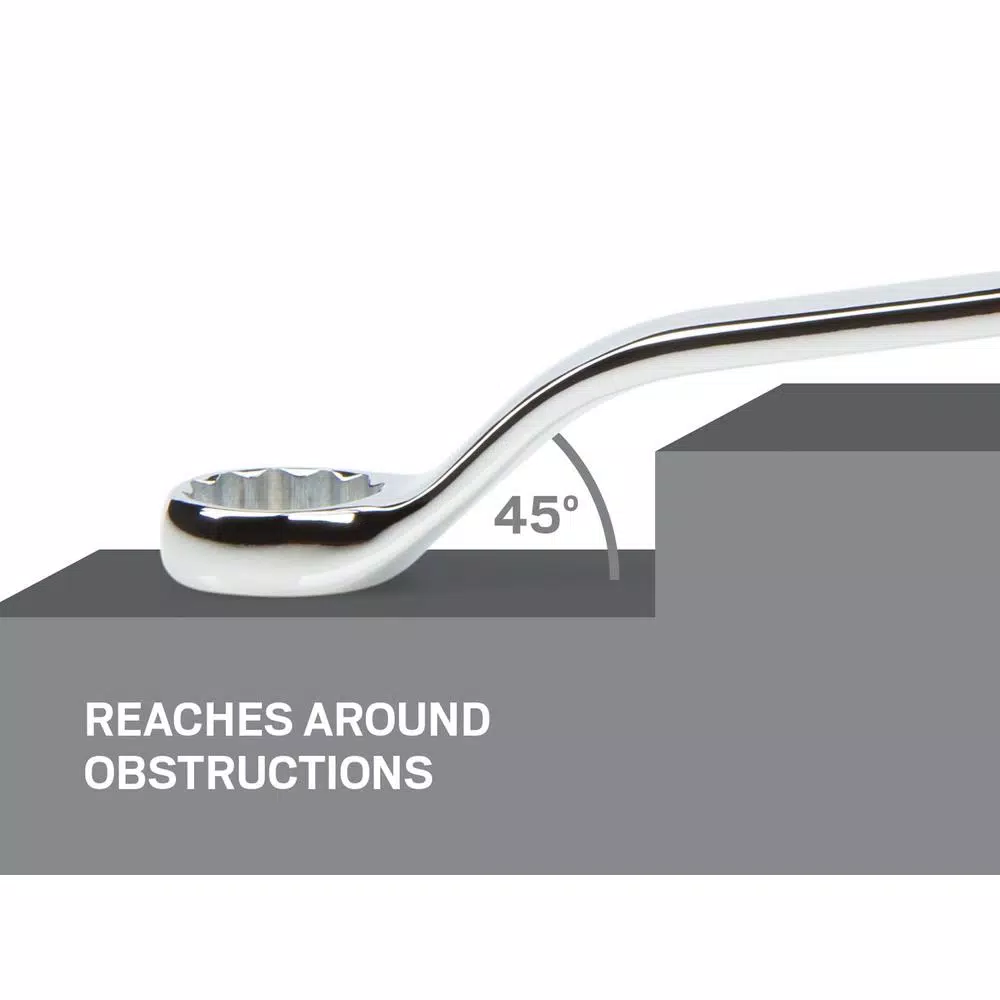 Generous Offset: Each end is offset 45°, creating plenty of clearance for your fingers and allowing an easy reach over and around obstructions. 12-Point Openings: Doubling the access angles of 6-point wrenches, these 12-point openings make it easier to work in tight -Rounding Geometry: To prevent damaging round-off, the geometry of each opening contacts and applies force to the flat sides of fastener heads rather than the corners.